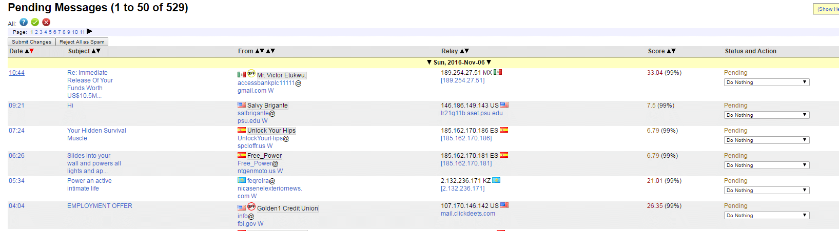 - Non-Spam: This is a list of emails that were quarantined due to various reasons, but are not typical spam. These usually score under 10, but over 5.